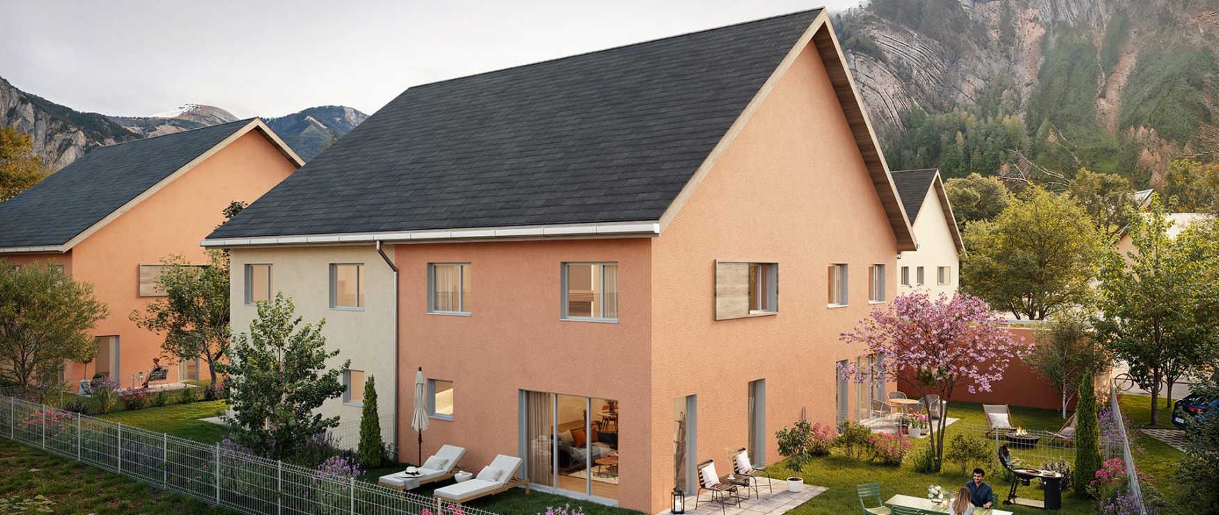 Les volumes simples, les matériaux naturels et les toitures à deux pentes rappellent l’identité alpine tout en apportant modernité et clarté.