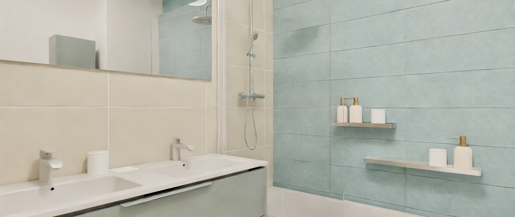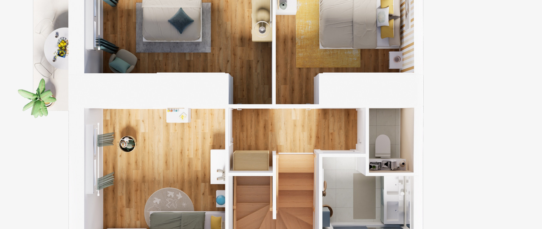 À l’intérieur, les prestations privilégient la qualité et la durabilité : chauffage par pompe à chaleur individuelleisolation RE2025menuiseries double vitragecarrelage grand formatparquet dans les chambres et faïence murale toute hauteur.